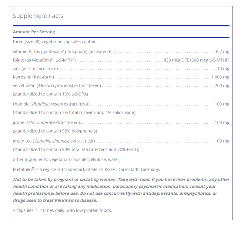 Supports dopamine production and maintains healthy reuptake for daily mental function and sharpness.*