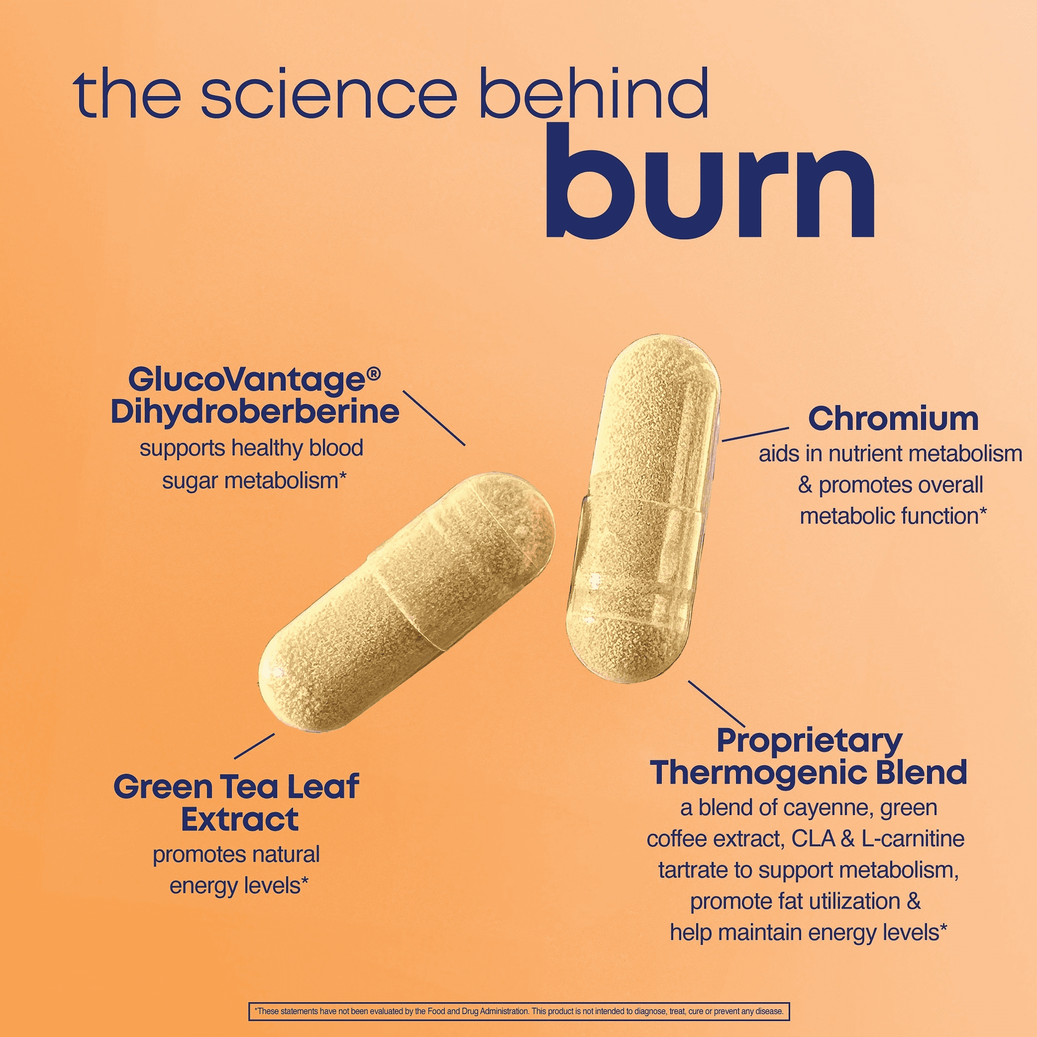 Burn, energize, repeat. A blend of green tea and chromium helps to support energy and boost metabolism, while our thermogenic blend helps promote weight management. Burn may help you say goodbye to cravings and those late-night munchies.